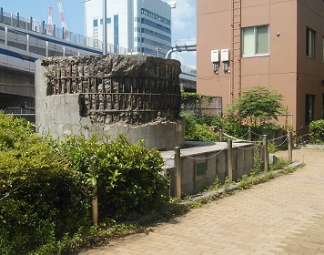 ビル南側の国道2号線沿いに、倒壊した橋脚の一部が展示されて