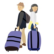 大きな旅行キャリーバックを置いて困っている様子。